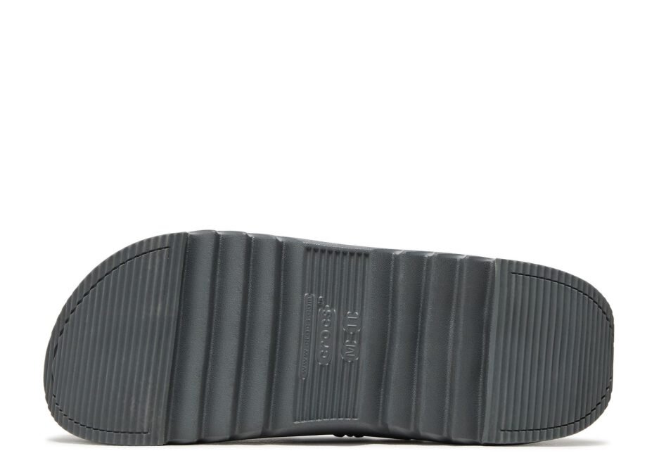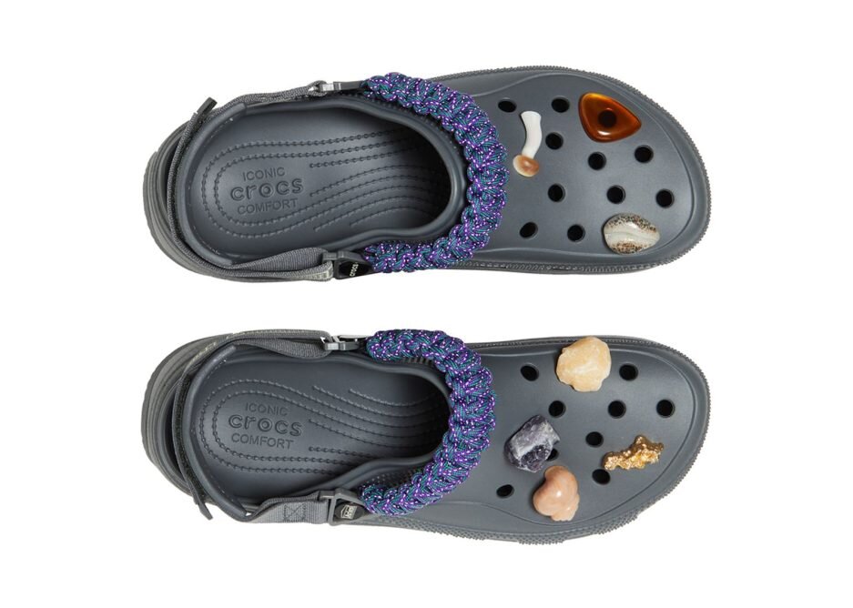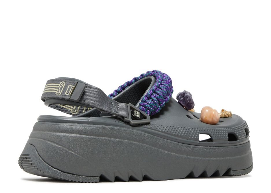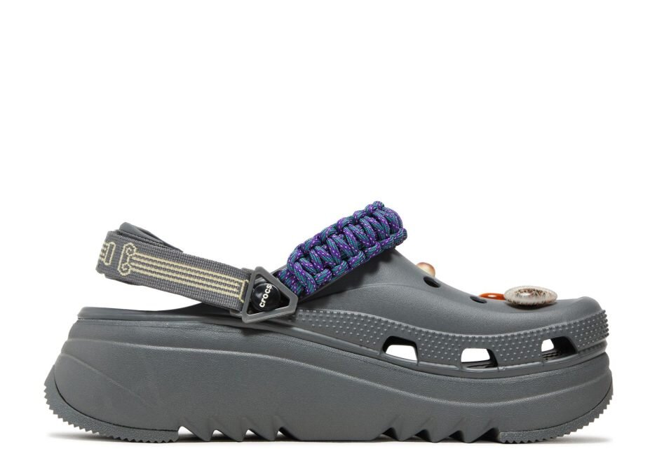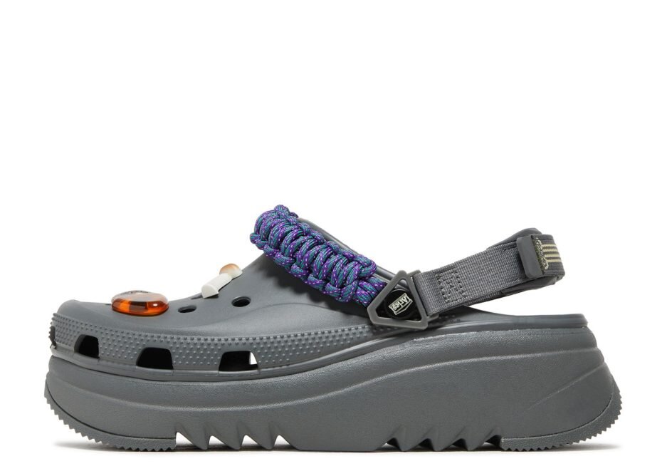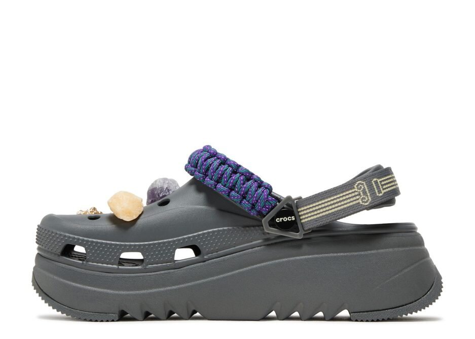 The Aries x Crocs Classic Hiker Xscape Clog in ‘Slate Grey’ is a rugged slip-on that is part of a footwear collaboration with the London-based clothing brand. The upper in a grey Croslite foam has a purple paracord strap featuring reflective accents and a flexible heel strap. Evoking the spirit of a beachcomber’s discoveries are custom Jibbitz charms, including natural amber stones, amethyst and citrine crystals and seashells. The platform midsole is finished in a matching grey shade and supported by a sawtooth outsole.