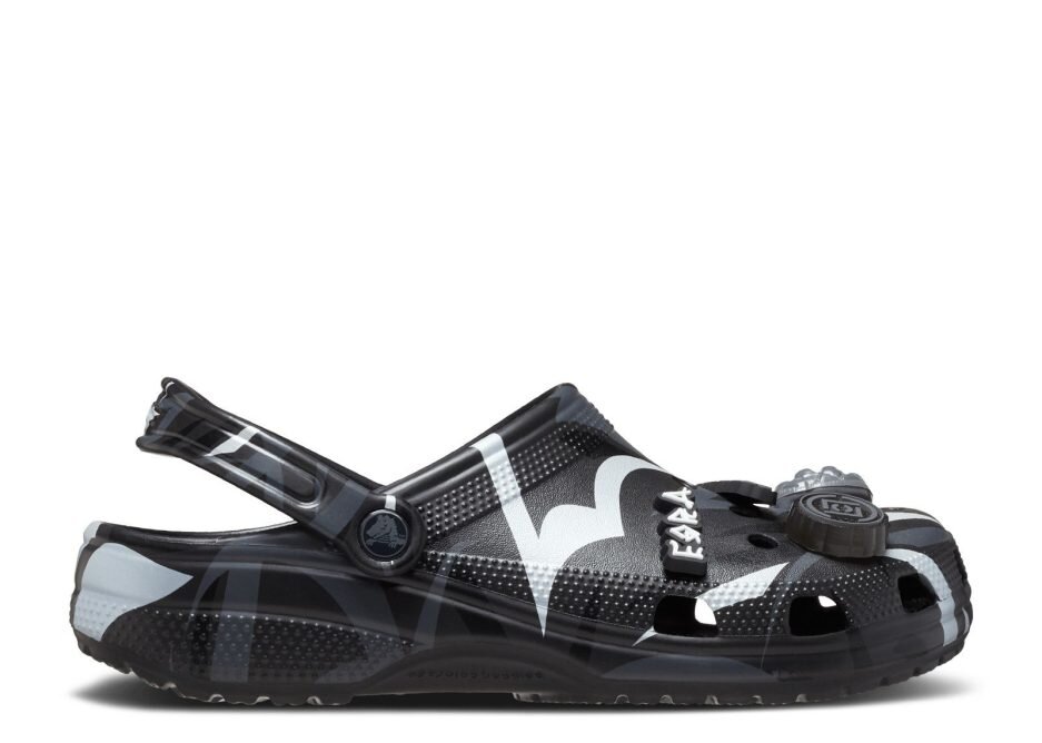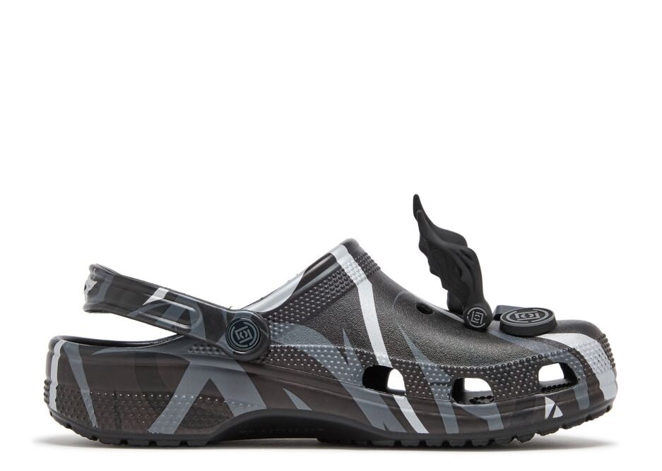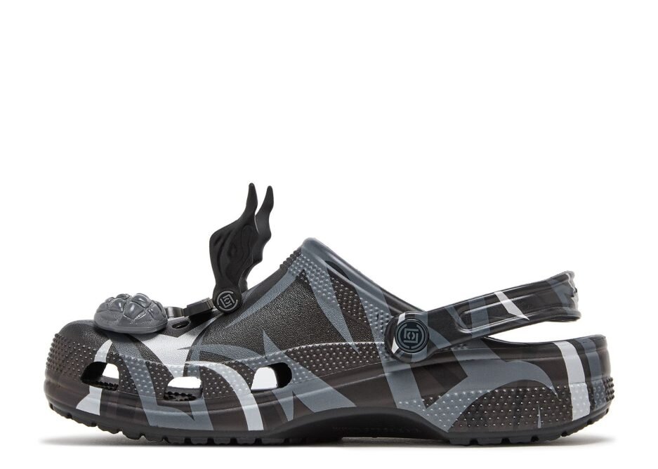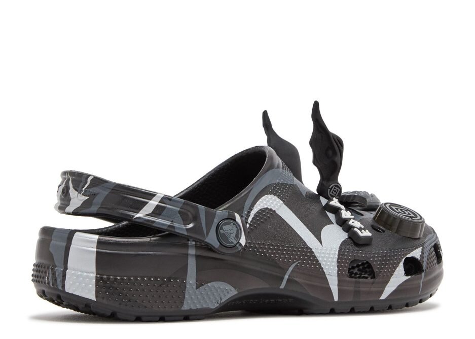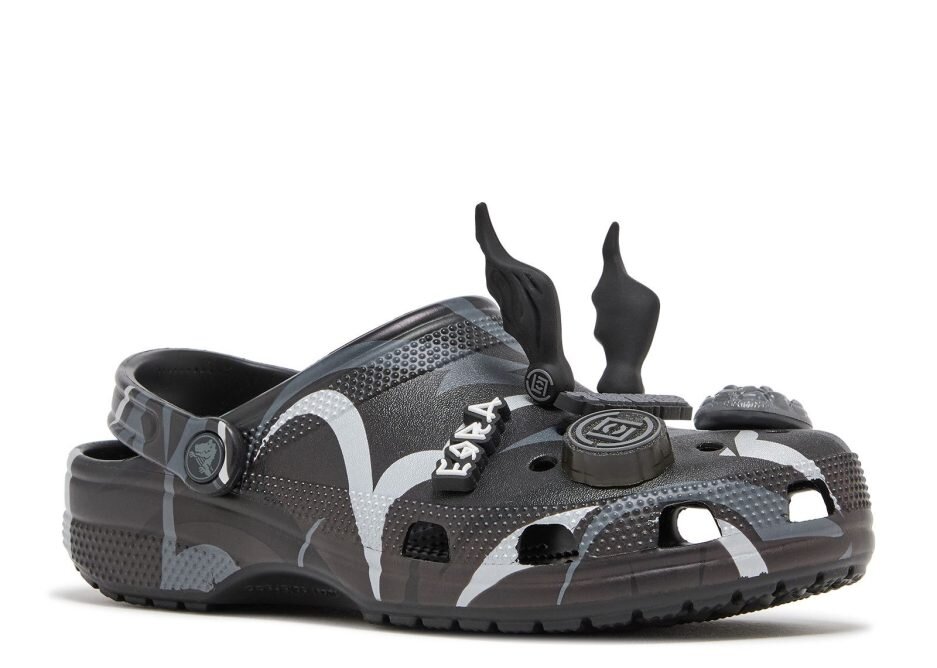 The CLOT x Crocs Classic Clog ‘Black’ sports CLOT’s Alienegra camo print, using black and grey hues with reflective brush-strokes. A pivoting heel strap gets the CLOT logo on the rivet, while vent ports enhance breathability to keep your feet dry. These clog can be customized with Jibbitz charms that include alien heads, pointy alien ears and UFOs.