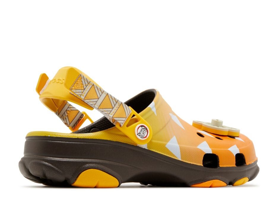 The Demon Slayer x Crocs All-Terrain Clog ‘Zenitsu’ takes design cues from the anime series. Inspired by Zenitsu Agatsuma, these slip-ons have a molded foam upper in a gradient yellow finish accented with white triangles. The Demon Slayer logo is showcased on the contoured footbed and swiveling heel strap. A set of Jibbitz charms include Chuntaro, the bird that sits atop Zenitsu’s head.